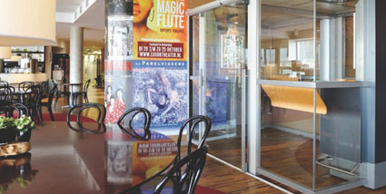 Crowded company sit at the table in a newly opened hotel's bar. One of